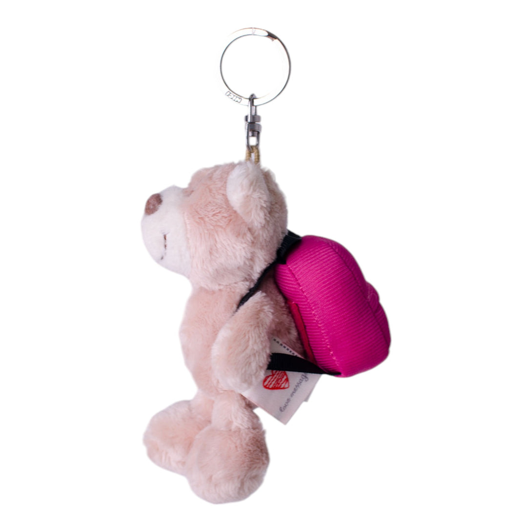 It's a plush Love Bear keychain featuring soft, high-quality material and a miniature version of OUTDOOR PRODUCTS' classic blue backpack. The design is both cute and adventurous.
