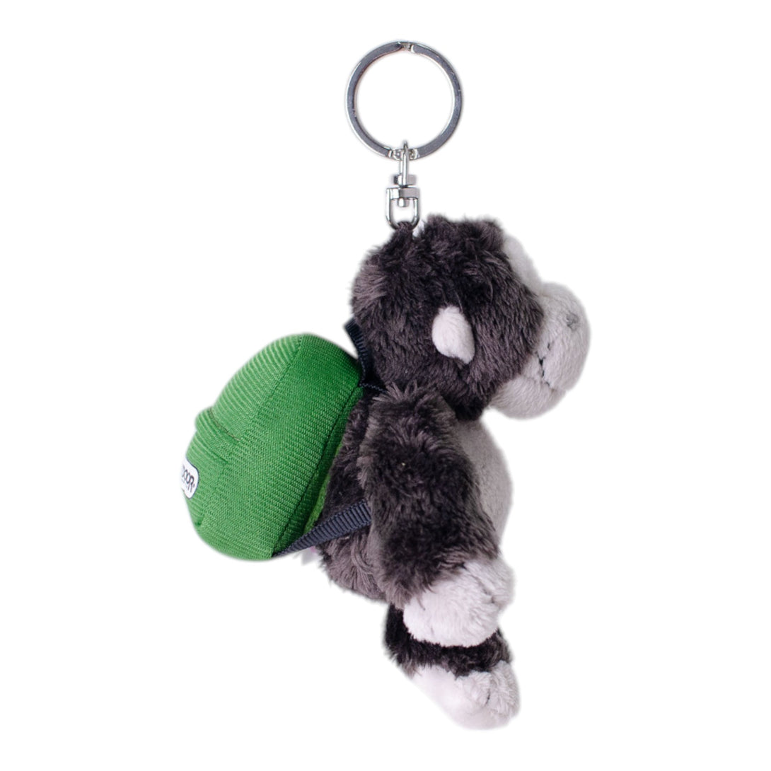 It's a plush Gorilla keychain featuring soft, high-quality material and a miniature version of OUTDOOR PRODUCTS' classic blue backpack. The design is both cute and adventurous.